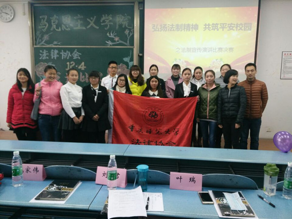为培养在校大学生法律意识、增强法制观念,提高学生运用法律知识维护自身合法权益的能力,马克思主义学院法律协会和重庆师范大学社团联合会共同举办的“弘扬法制精神共筑平安校园”为主题的法制宣传演讲比赛决赛于2015年12月17日在弘德楼5302教室隆重举行。莅临本次活动的是马克思主义学院的研究生:郝梅、魏家伟、叶瑞以及刘君,参加本次活动的有法律协会的全体成员。