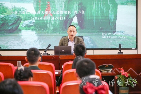 第二堂课由纪念馆馆长周万任亲自担纲主讲,题为《强渡大渡河:红军长征最神奇的篇章》。周馆长引经据典、深入浅出的讲解,为在场的师生们精心烹制了一场关于强渡大渡河历史的视听盛宴。他以其独特的视角和生动的叙述,带领大家穿越时空,共同见证那段波澜壮阔、英勇无畏的伟大历史。
