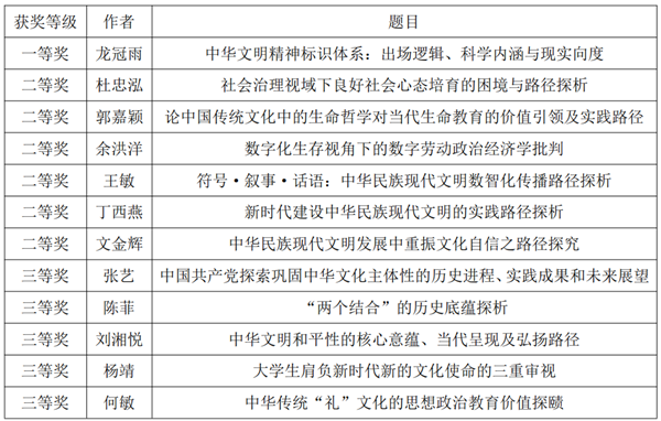 研究生龙冠雨凭借论文《中华文明精神标识体系:出场逻辑、科学内涵与现实向度》脱颖而出,荣获一等奖,杜忠泓等6位同学荣获二等奖,张艺等5位同学荣获三等奖。在“获奖代表发言”环节中,龙冠雨等13位获奖代表进行精彩发言。