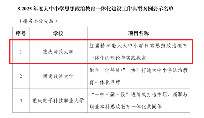 姜土生院长组织申报的 “红岩精神融入大中小学思想政治教育一体化的理论与实践探索”项目,入选大中小学思想政治教育一体化建设工作典型案例。