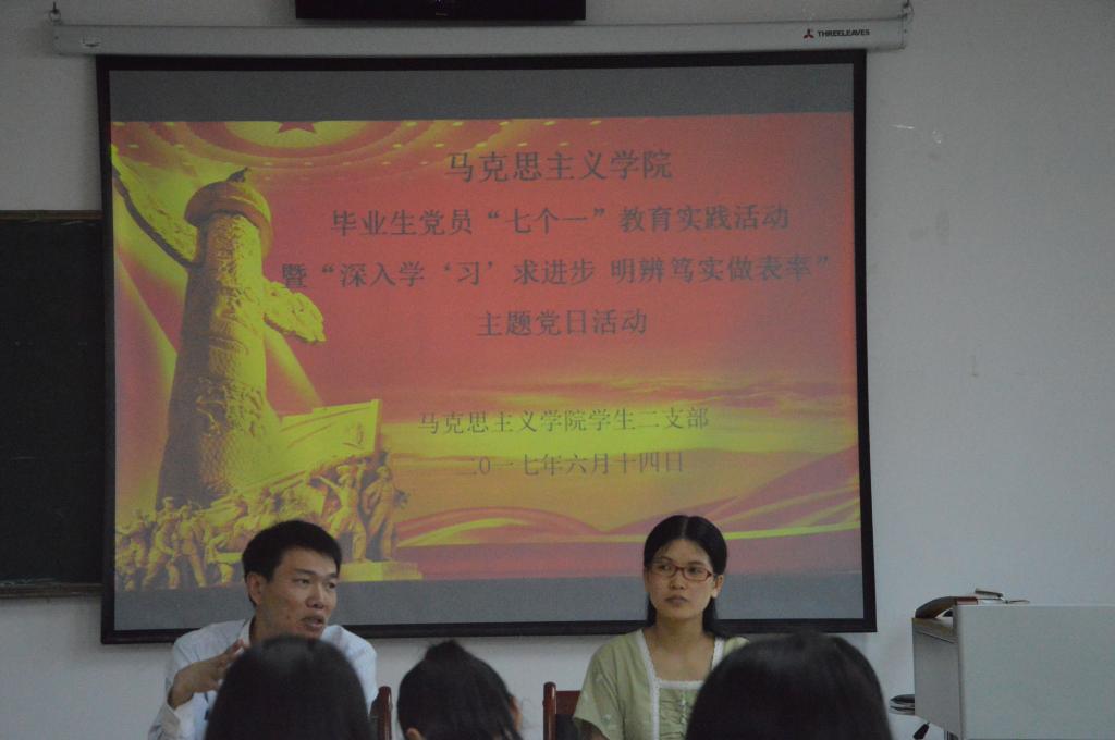 为加强毕业生党员对党的认知,促使其毕业后能更好的学习与工作。马克思主义学院于2017年6月14日在汇贤楼201教室举办了毕业生党员“七个一”教育实践活动暨“深入学习求进步 明辨笃实做表率”主题党日。本次活动邀请到了马克思主义学院党委副书记姜土生和马克思主义学院第二支部支部书记张晓庆作为嘉宾,2013级和2014级全体本科学生党员参与本次活动。