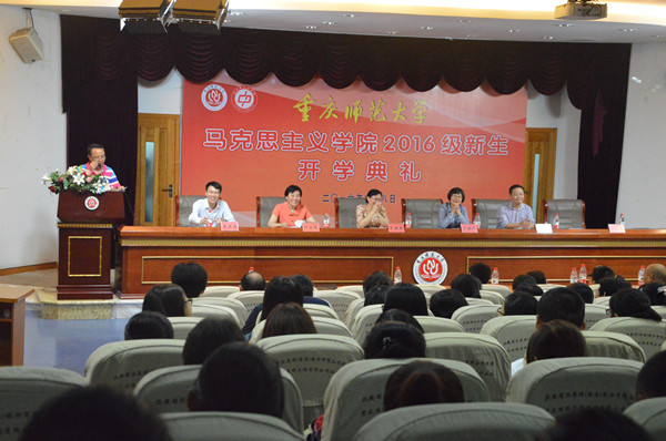 又迎来了一批活力四射的学子。2016年9月8日16时30分,重庆师范大学马克思主义学院2016年级新生开学典礼在凯撒报告厅隆重举行。学院院长吴晓燕教授、党委书记万朝晖老师、前院长柯佳敏教授、副院长况明安、党委副书记姜土生、教师代表王建斌及全体教职工出席本次活动。2016级全体新生以及团总支·学生会全体成员参与。本次活动由院党委副书记姜土生主持。