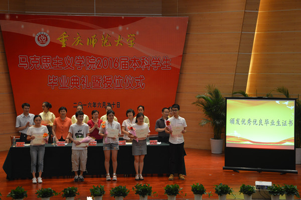 毕业典礼结束后进行了授位仪式。授位仪式由院长吴晓燕主持,学位委员会主席陈洪宣读了《重庆师范大学学位委员会授位决议》,院学位委员会委员陈洪、柯佳敏、孔毅、王桂林、田方林、王勇教授为获得学士学位的174名毕业生颁发学位证书。
