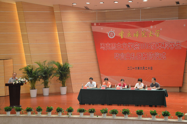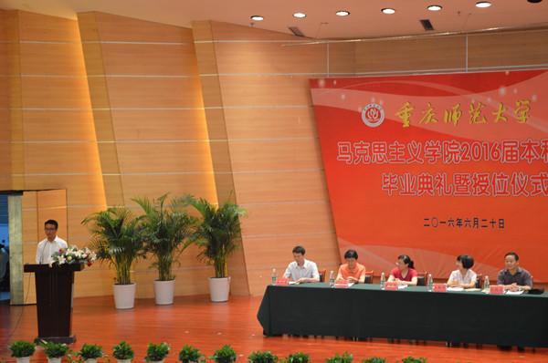 2016届本科生毕业典礼暨授位仪式在校友会堂音乐厅隆重举行。马克思主义学院院长吴晓燕,学院党委书记万朝晖,副院长况明安,学院学位委员会委员以及马克思主义学院全体教师出席本次毕业典礼。马克思主义学院全体本科毕业生、学生会全体成员以及低年级学生代表参加。本次大会由院党委副书记姜土生主持。