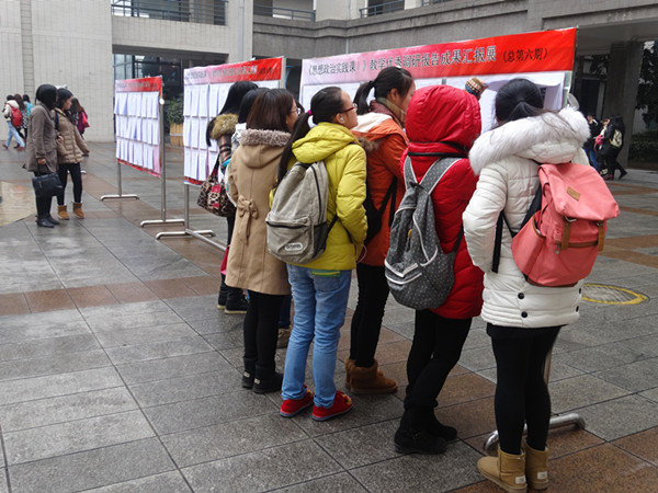 1月5日,我校马克思主义学院“思想政治理论课实践教学优秀调研报告汇报展”(总第六期)在弘德楼中庭隆重举行。本次展出的调研报告,是从我校2012级历史与社会学院、文学院、外语学院、生命科学学院、化学学院、物理与电子工程学院、计算机与信息科学学院的同学们在历时半年的实践教学活动中产生的调研报告中遴选出来的部分优秀作品,共计81篇。同时还展出了同学们在参加社会实践活动过程中的图片资料。
