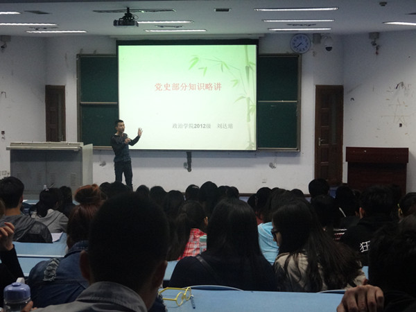 在主持人简单介绍情况后,由来自传媒学院的尧老师致词。她简明扼要的分析了时下的形势,还对马克思主义学院和传媒学院的发展献上了诚挚的祝福。接下来,由来自马克思主义学院的四位优秀党员代表就当前的形势与政策进行宣讲。首先,由马克思主义学院2012级刘达培宣讲有关党史的部分知识。他从部分党史问题引入“党的基本知识回顾、党的重要会议提要、入党常用文书写作”三个内容,内容丰富精彩,赢得了一片热烈的掌声;接下来,2011级的孙美玲从全国两会、重庆市市情、重庆师范大学校情三个方面全面深入分析了当今形势与政策,层层紧扣,给大家留下了深刻的映象。最后,2011级的邝尚桢和李静分别从国内时事、国际时事出发,带领大家一起回顾时政,探讨更大范围的形势政策。活动最后,由马克思主义学院团总支学生会书记胡颖作总结,她表示希望能和传媒学院有更多的合作,也期盼传媒学院就“新媒体的使用”和马克思主义学院进行相关交流。