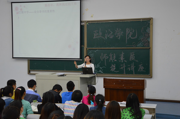 组织2011级全体学生于2014年4月21日下午4点半在图北楼7201开展了师范生素质技能讲座,主讲人为重庆南开中学韩琳老师,出席此次讲座的有马克思主义学院团总支书记马小又、专业教师吴涯。